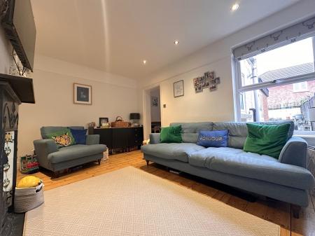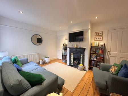 Smooth ceiling with inset spotlights, uPVC double-glazed window to rear, Victorian-style fireplace, exposed flooring, picture rail, radiator, built-in under-stairs storage cupboard and door leading through to the breakfast area.