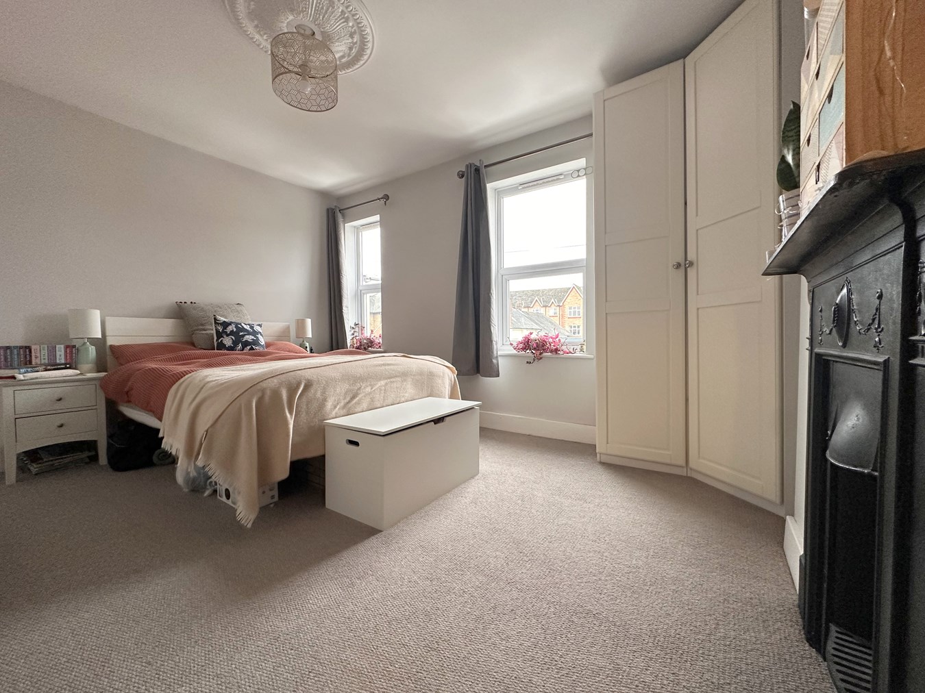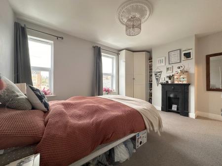 Two uPVC double-glazed windows to front, smooth ceiling, feature Victorian-style fireplace, radiator and built-in storage cupboard.