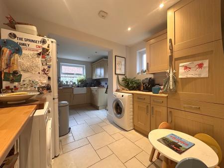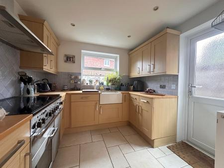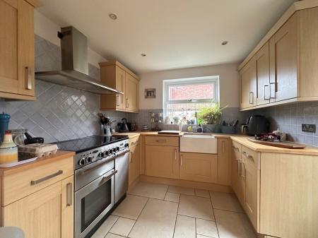 Smooth ceiling with recessed lighting, uPVC double-glazed window to rear and door to side access. Fitted with a range of base and wall units with roll-edge work surfaces incorporating a Butler-style sink with mixer tap, integrated dishwasher and Range cooker. Tiled splashbacks and tiled flooring.