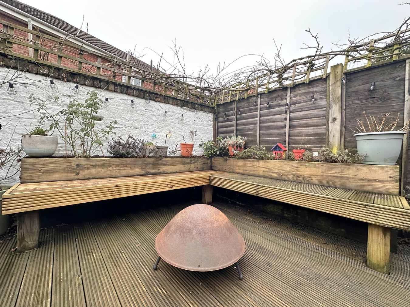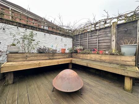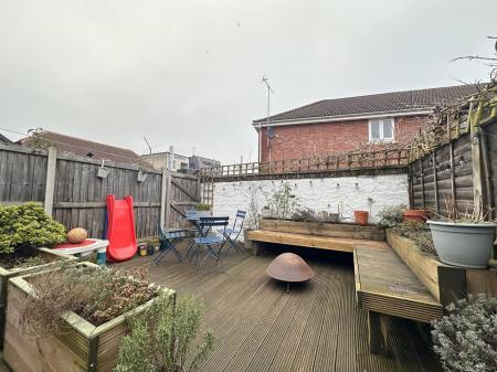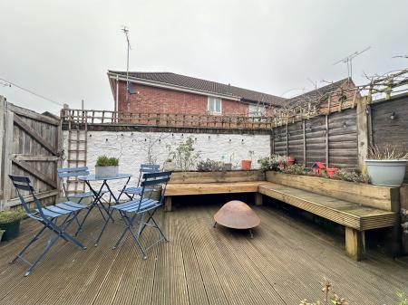 The front of the property is paved with a low brick retaining wall. To the rear, the landscaped garden is fully enclosed with gated side and rear access, featuring modern paving, a substantial raised decking area ideal for entertaining, integrated seating and mature planting.