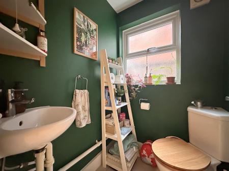 Smooth ceiling, uPVC double-glazed window to side, low-level WC, wash hand basin, radiator, extractor fan and tiled flooring.