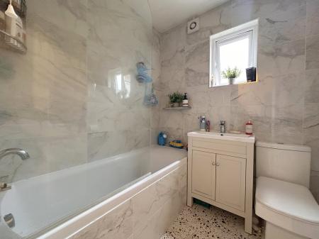 Stylishly finished bathroom featuring a white suite comprising bath with thermostatic mixer shower, vanity wash basin and WC. Marble-effect wall tiling, terrazzo-style flooring, heated towel rail, extractor fan, LED lighting and uPVC double-glazed window to rear.