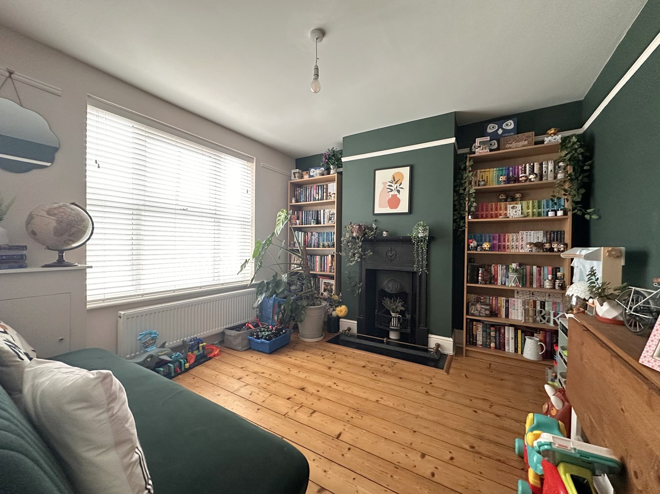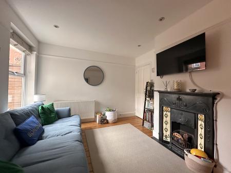 Smooth ceiling, uPVC double-glazed window to front with fitted blind, feature Victorian-style fireplace, exposed flooring, picture rail and radiator.