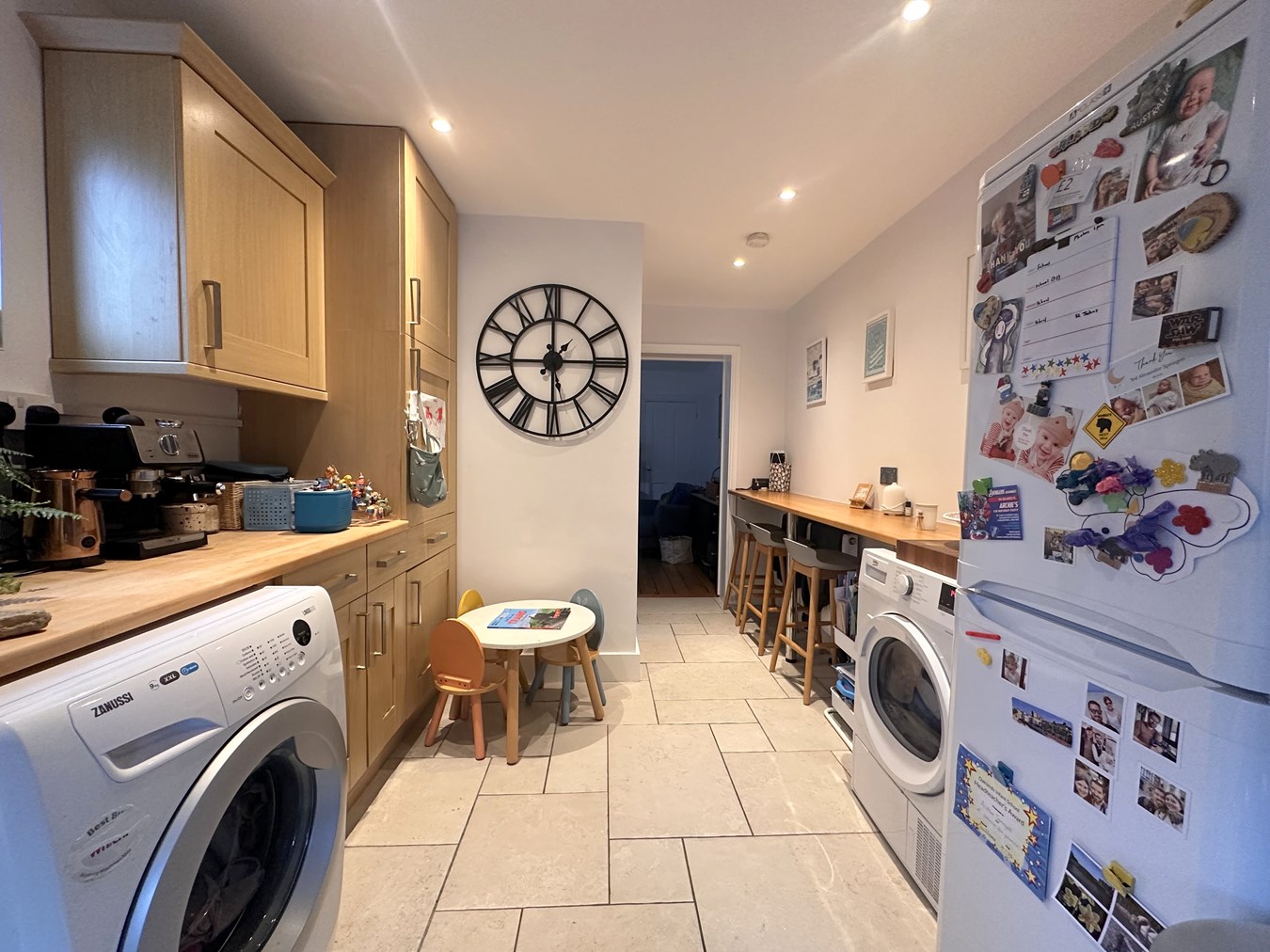 Smooth ceiling with recessed lighting, uPVC double-glazed window to side, radiator, tiled flooring, breakfast bar and open-plan access to the kitchen.