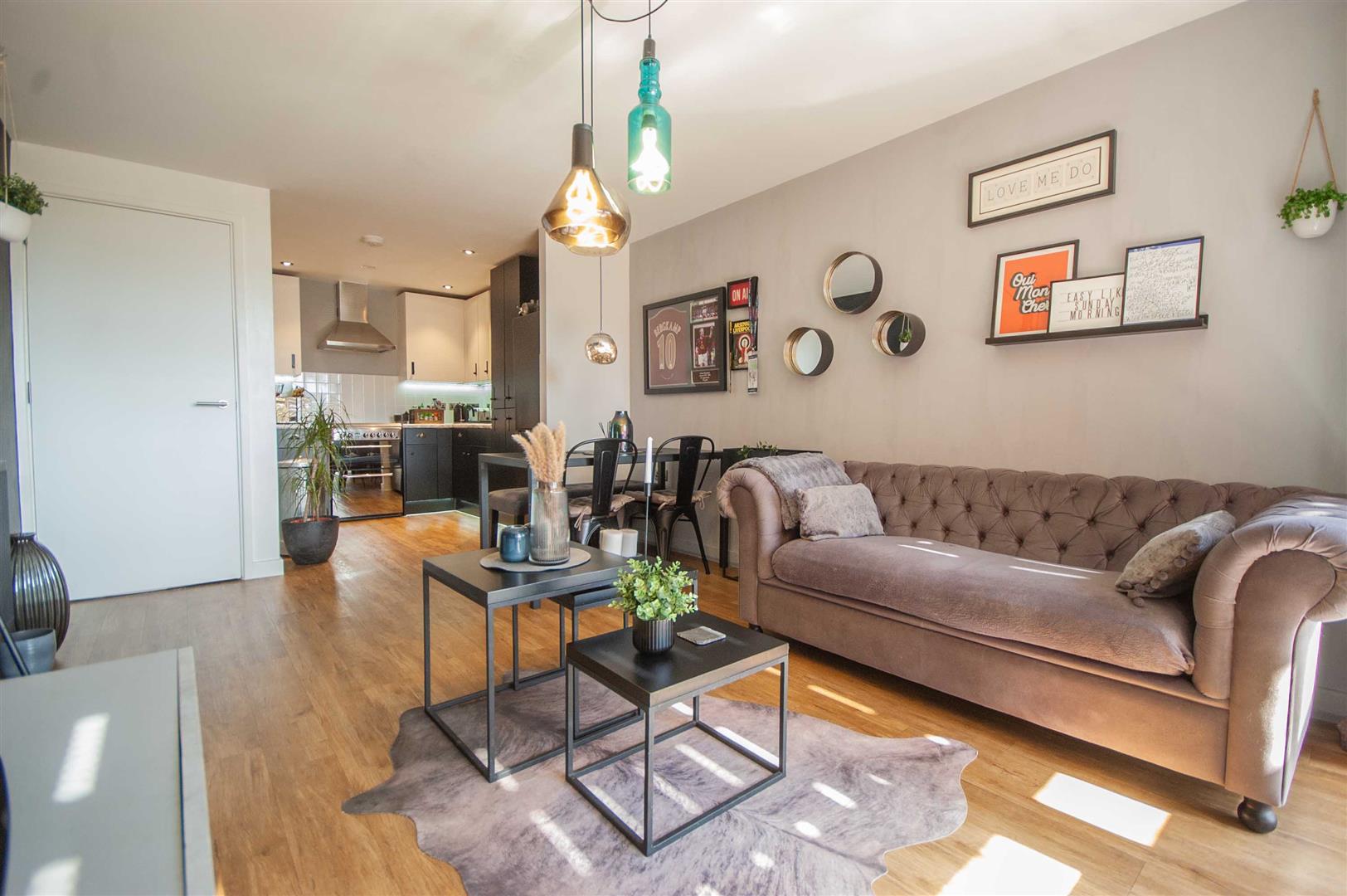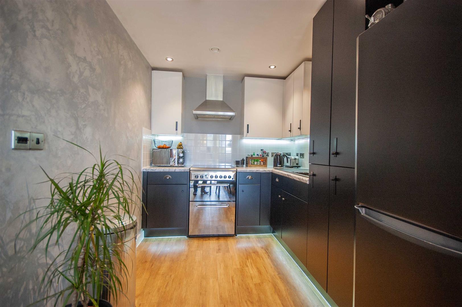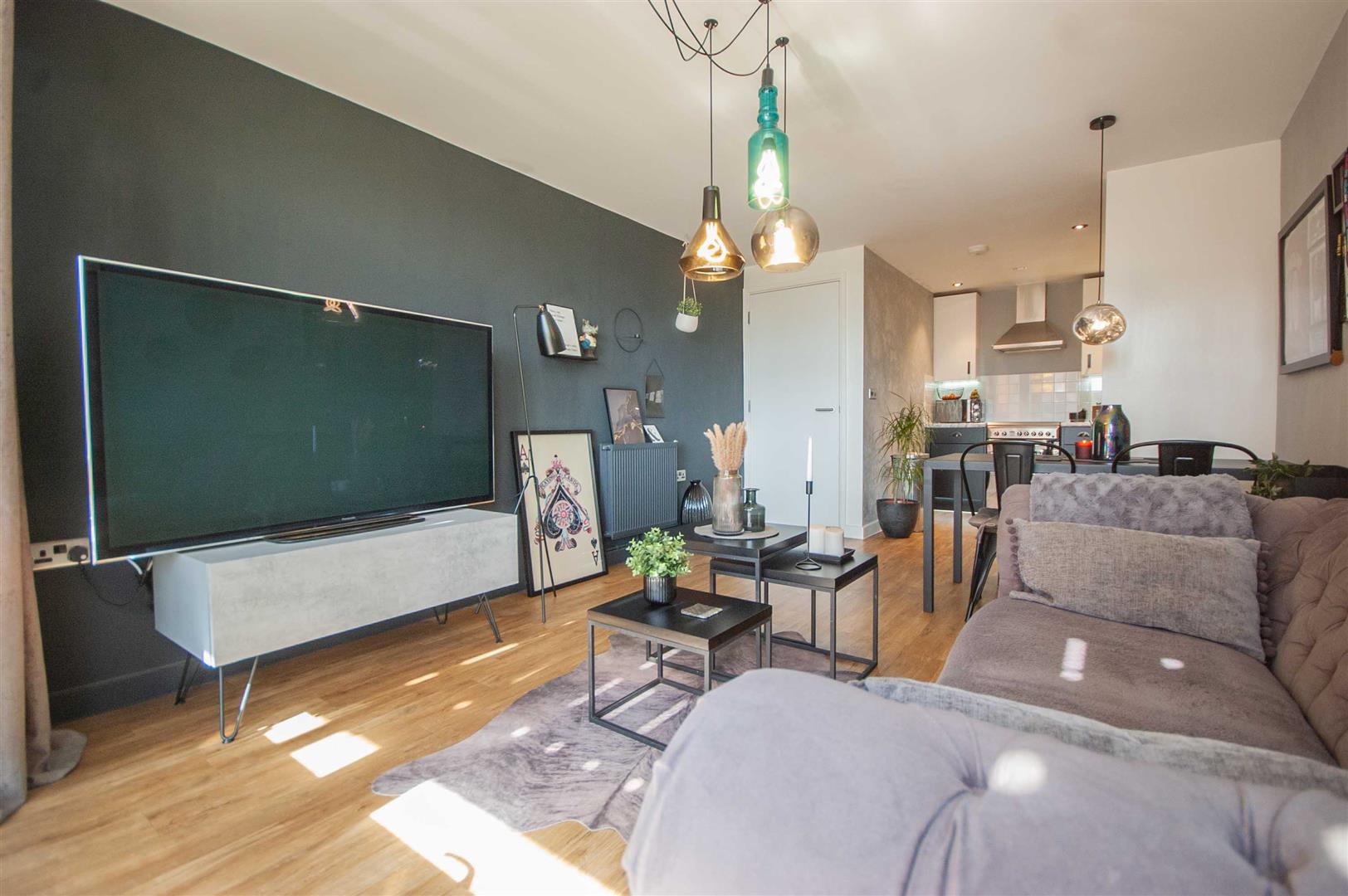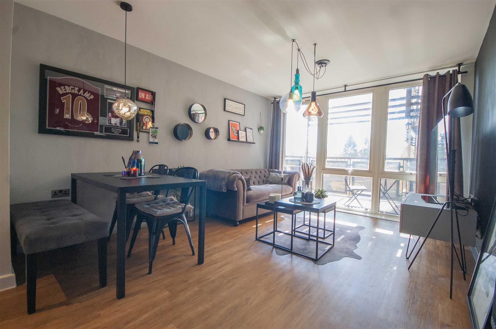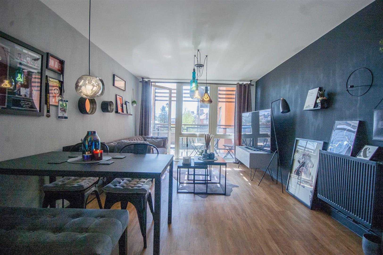 Open Plan Living Area: - 7.26m x 3.33m (23'10" x 10'11") - Double glazed door and window to rear balcony, radiator, wood effect flooring, open plan to:-