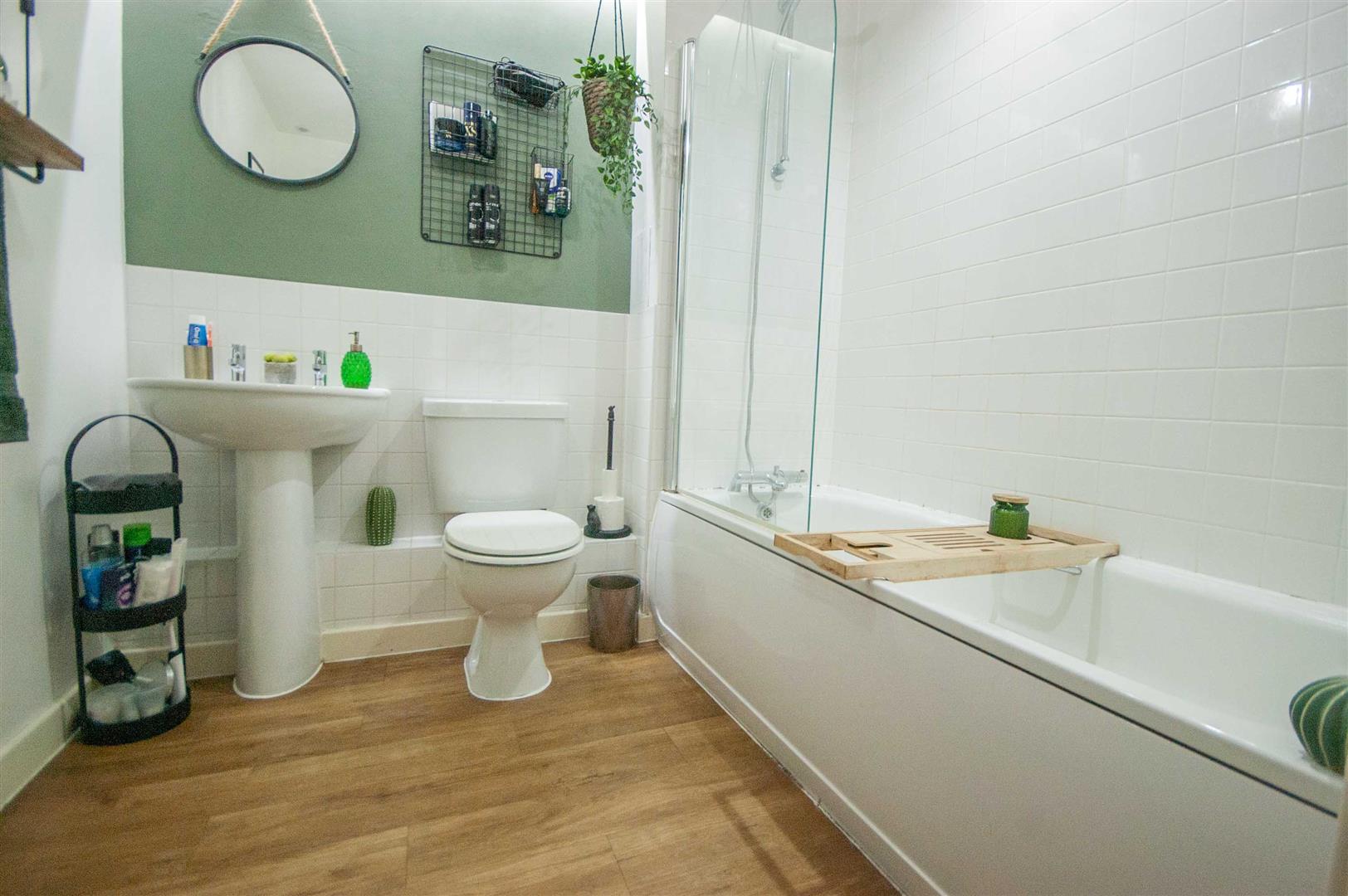 Bathroom: - 2.18m x 1.98m (7'2" x 6'6") - Panel bath with shower mixer tap, pedestal hand wash basin, low level W/C, radiator, part tiled walls, wood effect flooring.
