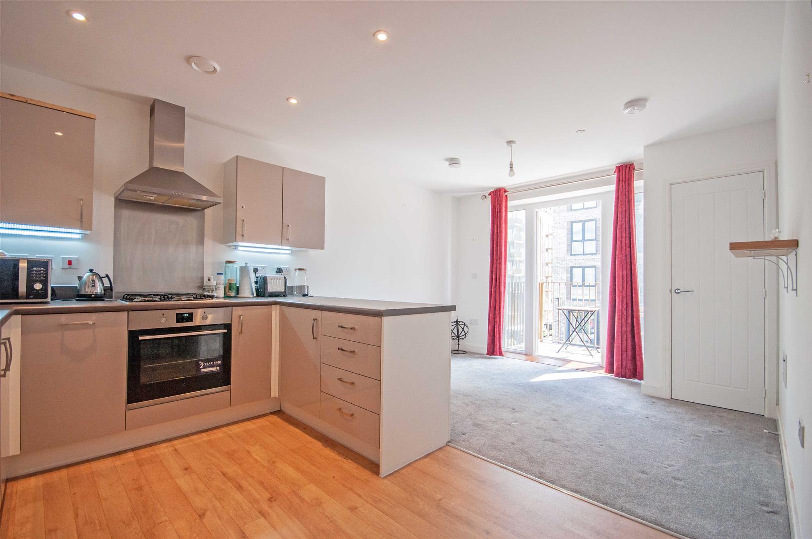 Open Plan Living Area: - 5.54m x 4.24m > 3.48m (18'2" x 13'11" > 11'5") - Door to balcony, cupboard housing boiler, two radiators, open plan to:-