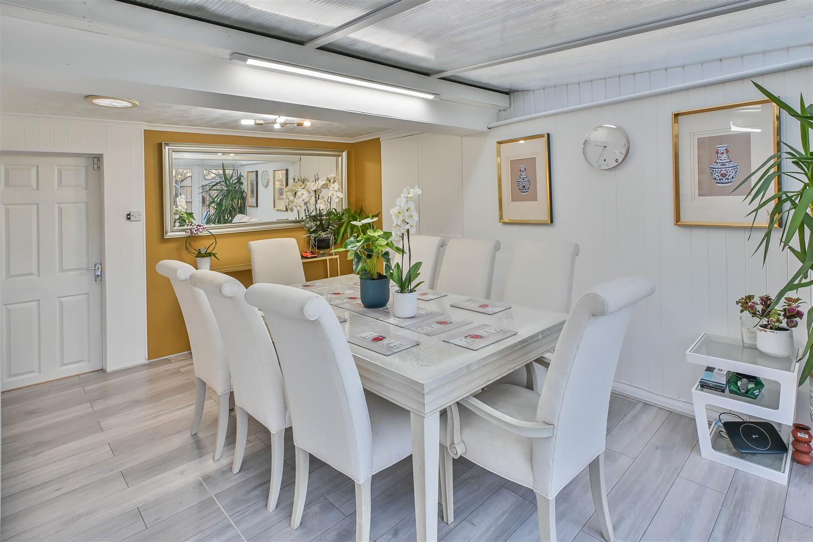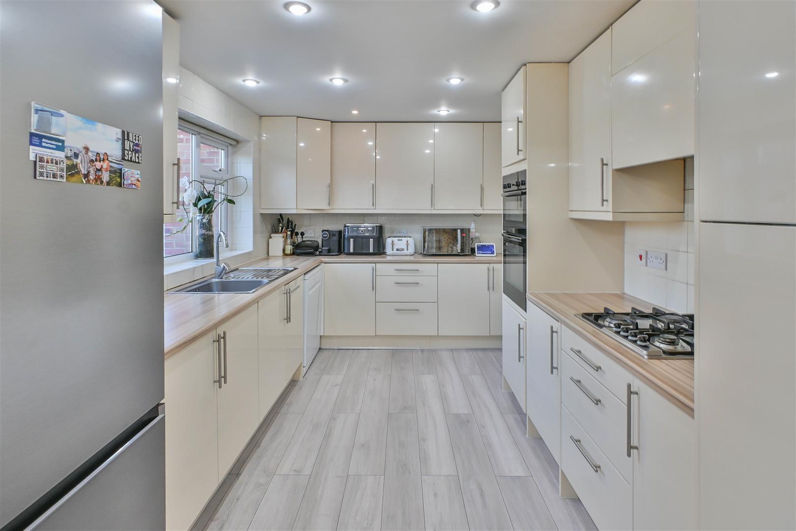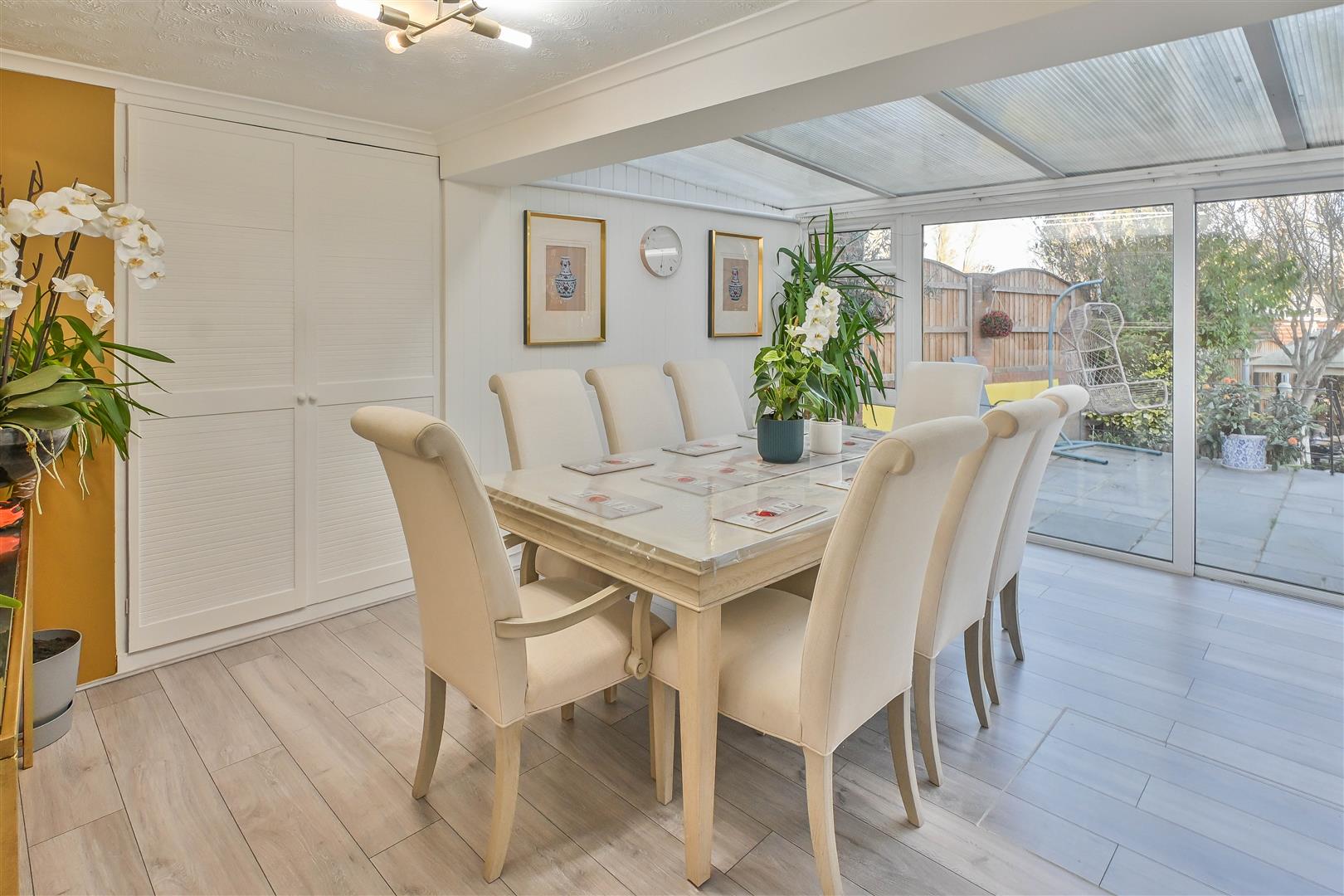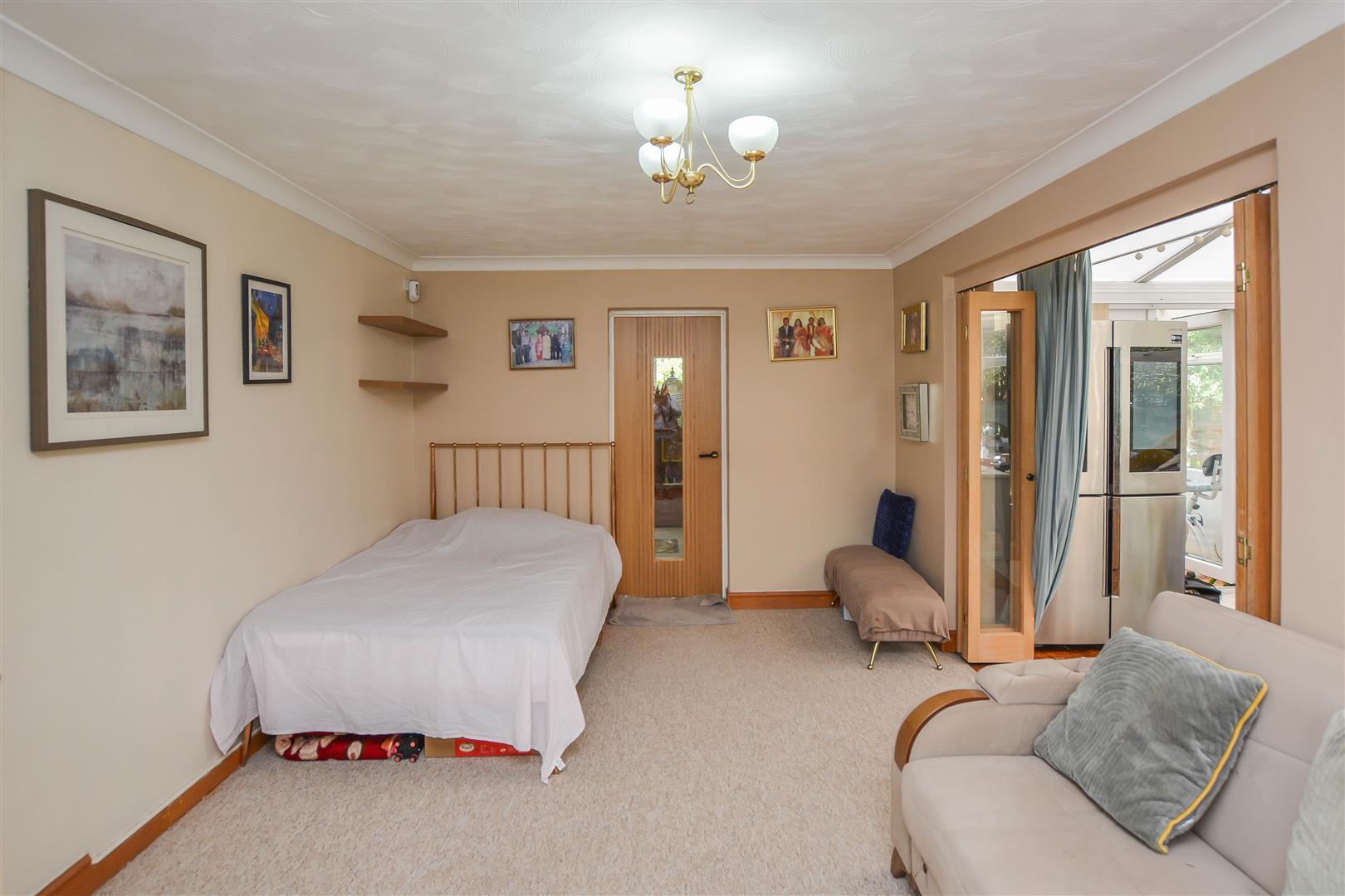 The internal accommodation begins with a welcoming lobby that opens into a spacious and elegantly appointed lounge, featuring dual-aspect sliding doors that bathe the room in natural light and provide seamless access to the rear garden. The well-equipped kitchen, fitted with a comprehensive range of eye and base level units and generous worktop space, flows effortlessly into a bright conservatory, perfectly suited as a dining area. A separate reception/dining room is positioned at the front of the property, offering flexibility for entertaining or family gatherings.