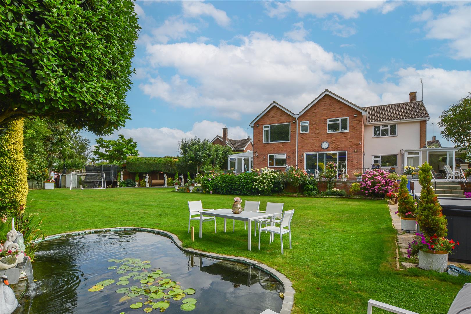 Externally, the beautifully landscaped rear garden begins with a large paved patio area leading to a manicured lawn, complemented by a large ornamental fishpond and an additional paved seating area-perfect for outdoor entertaining. To the front, a secluded garden adds to the property's kerb appeal, alongside a paved driveway offering off-street parking and access to the garage via an up-and-over door.