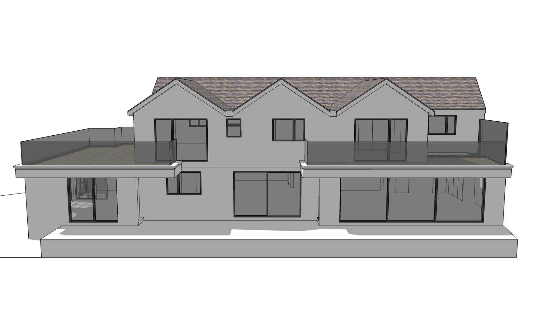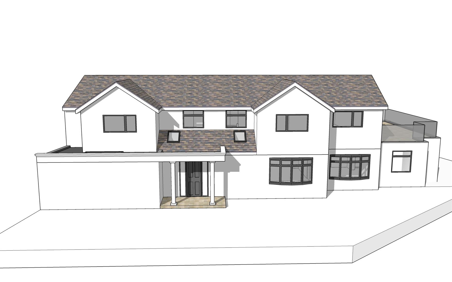 First floor rear and side extension with balcony to rear. Ground floor rear extension and garage conversion. Construction of new front porch.