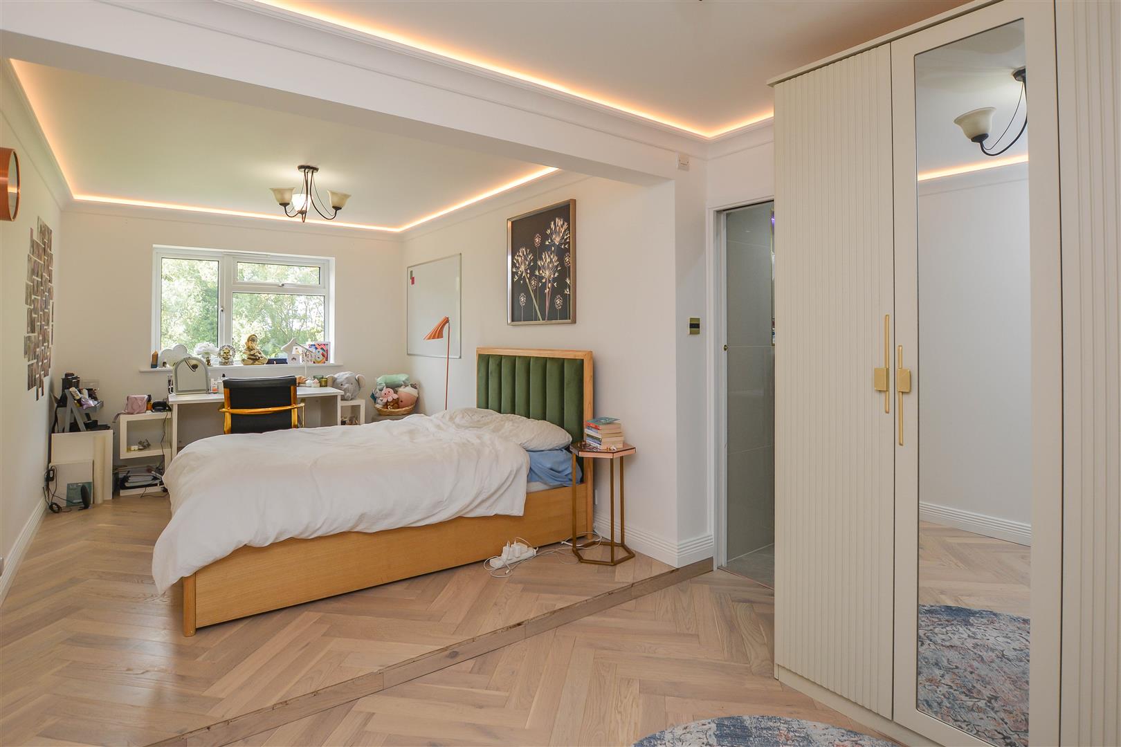 Ascending to the first floor, the principal bedroom suite impresses with its generous proportions, extensive built-in wardrobes, a dedicated dressing area, and a luxurious ensuite bathroom. Three further well-sized bedrooms, each with built-in wardrobes, are served by a stylish family bathroom, providing ample accommodation for a growing family.