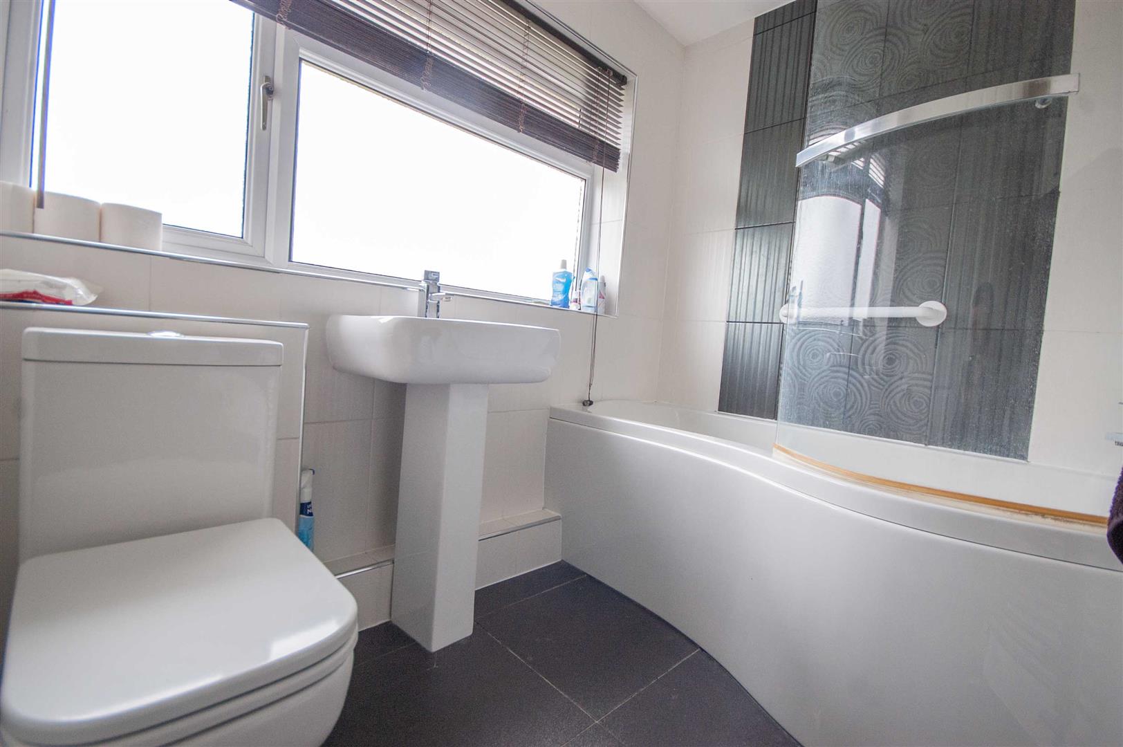 Family Bathroom: - 2.39m' x 1.65m (7'10' x 5'5") - Obscure double glazed window to rear, panel bath with shower over, pedestal hand wash basin, low level W/C, chrome towel radiator, tiled walls and flooring.