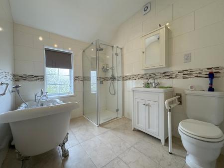 Upstairs, you'll find two bedrooms — a generous double and a single, both featuring charming character fireplaces and built-in storage. The spacious family bathroom completes the first floor and boasts a freestanding bath, separate shower, wash hand basin, and WC.