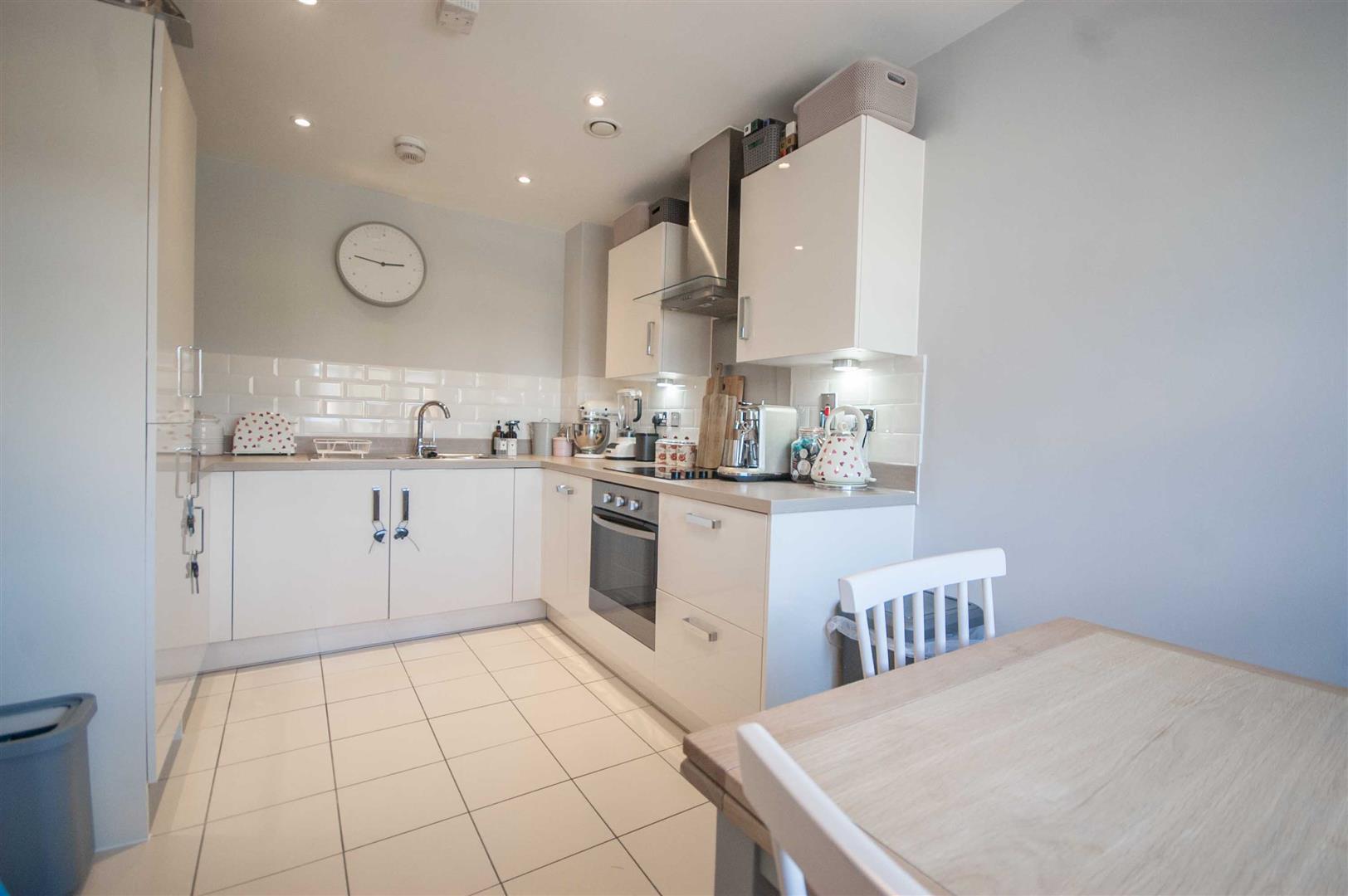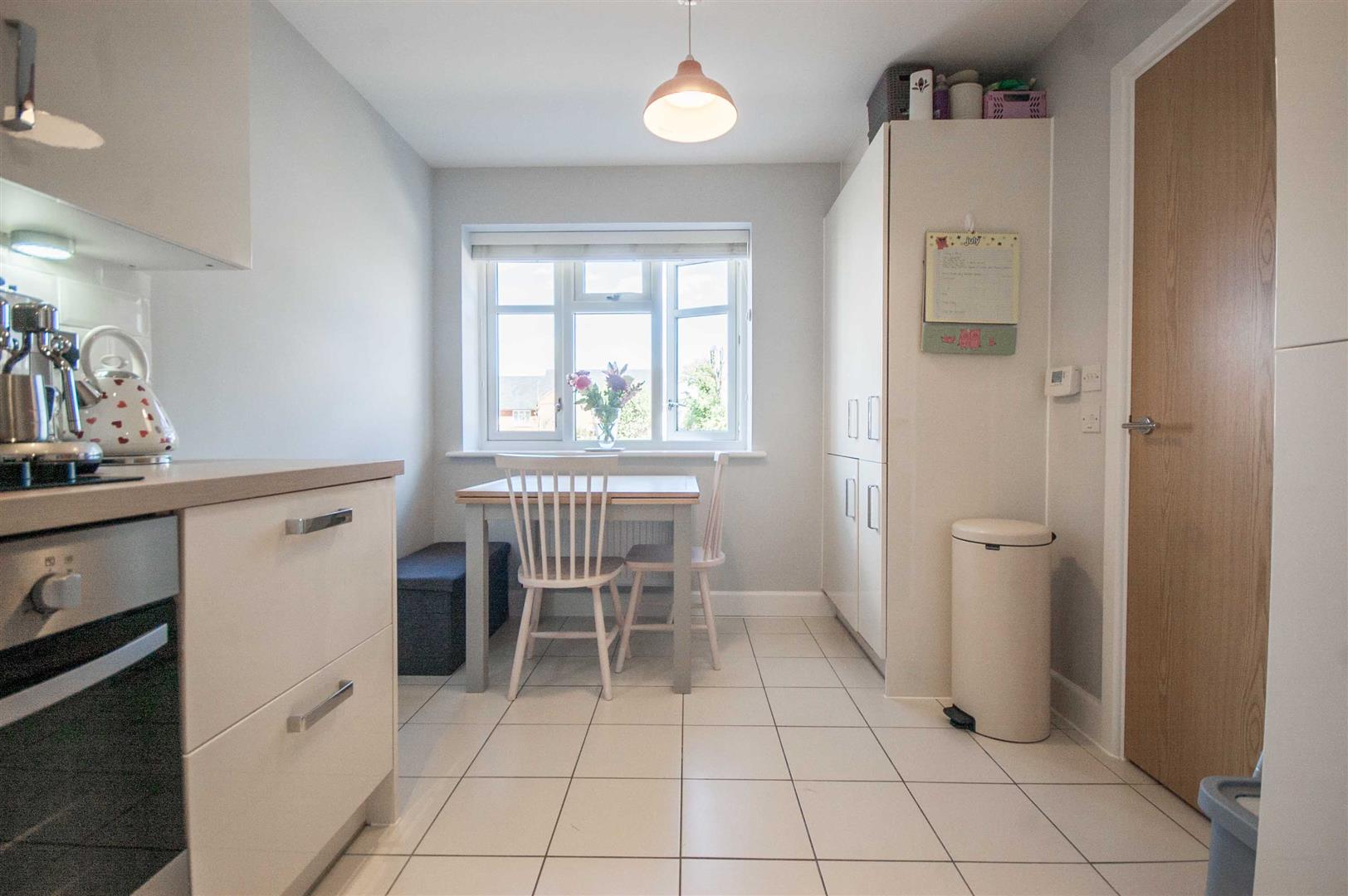 Kitchen Diner: - 4.27m x 2.67m (14' x 8'9") - Double glazed window to front, range of wall and base units, square edge work surfaces with stainless steel sink inset, integrated fridge freezer, washing machine, dishwasher, low level oven, electric hob with stainless steel splashback and extractor over, radiator, part tiled walls, tiled flooring.