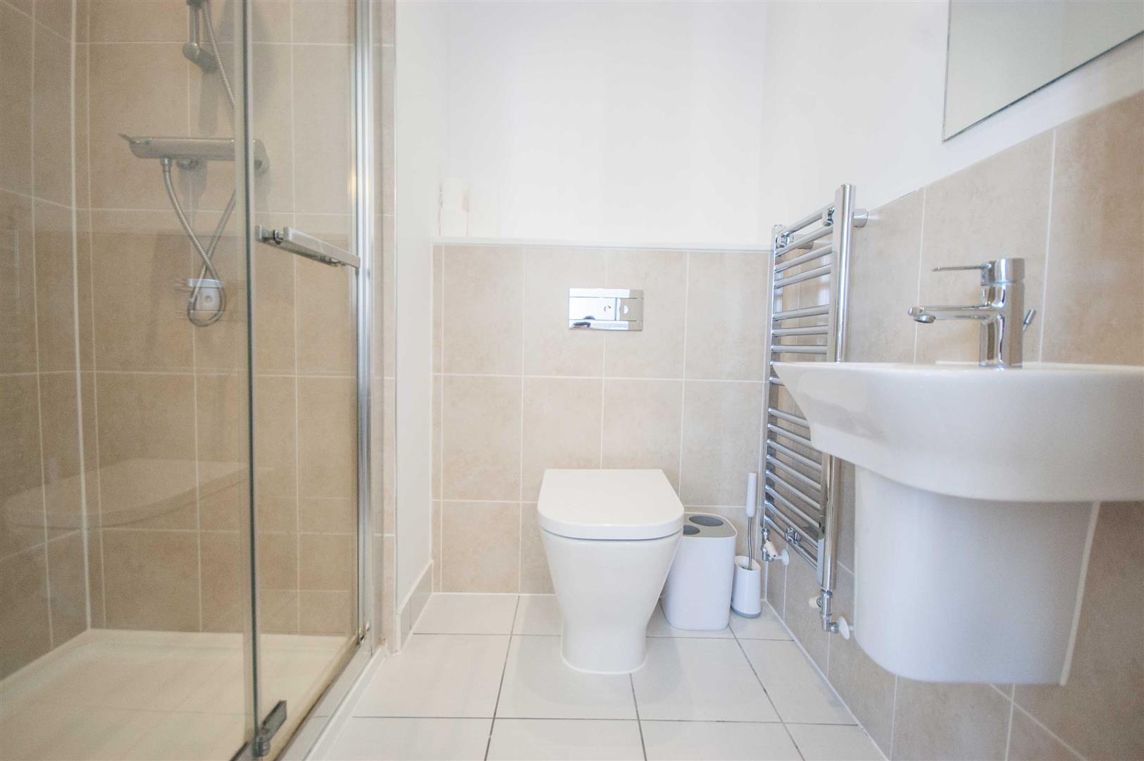 En-Suite: - 1.88m x 1.52m (6'2" x 5') - Fully tiled double shower cubicle, low level W/C, wall mounted hand wash basin, chrome towel radiator, part tiled walls, tiled flooring.