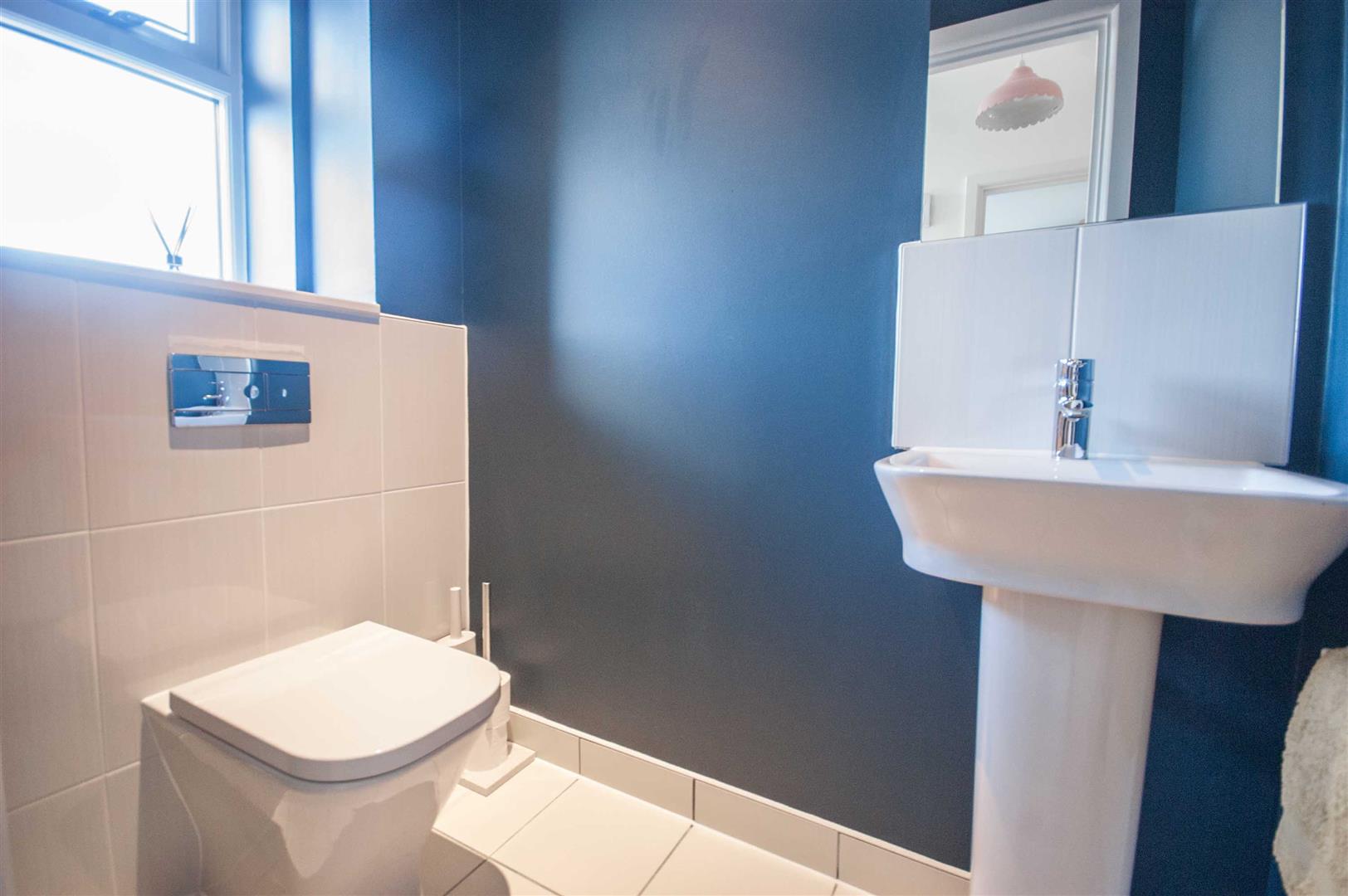 Cloakroom: - Obscure double glazed window to front, low level W/C, pedestal hand wash basin, radiator, tiled flooring.