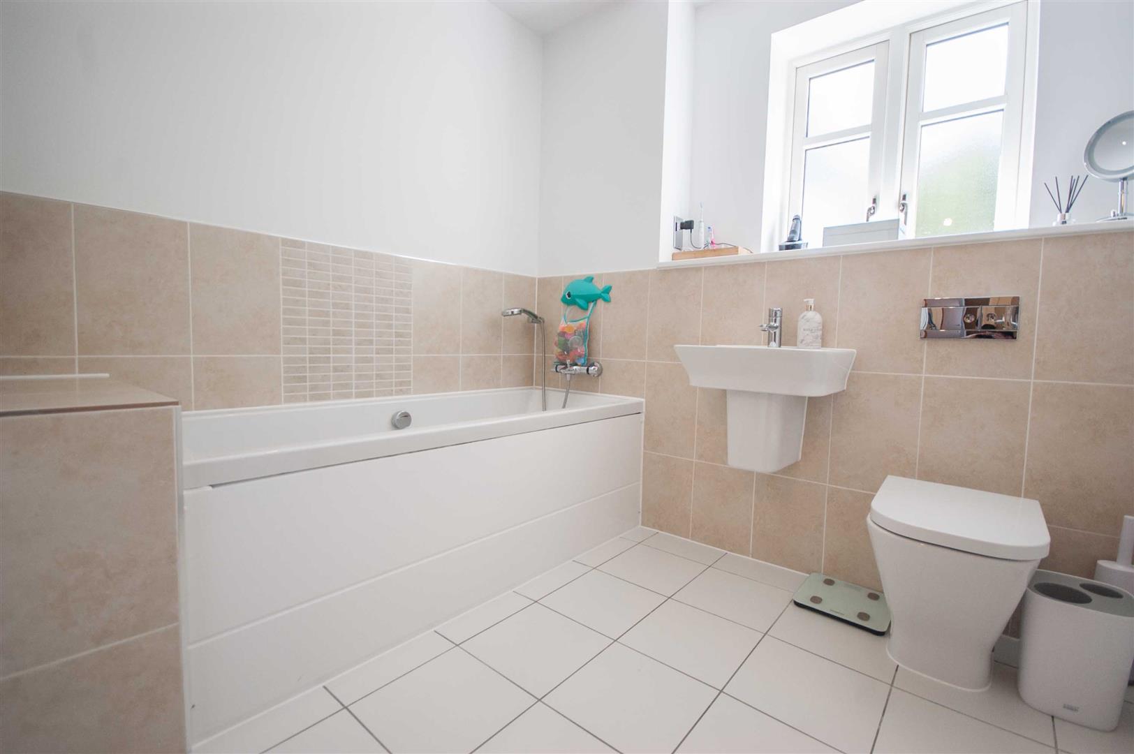 Family Bathroom: - 2.24m x 2.01m (7'4" x 6'7") - Obscure double glazed window to rear, panel bath with shower mixer tap, wall mounted hand wash basin, low level W/C, chrome towel radiator, part tiled walls, tiled flooring.