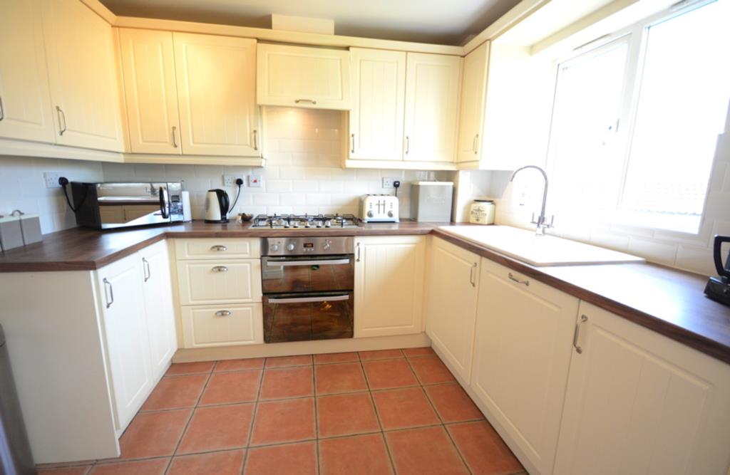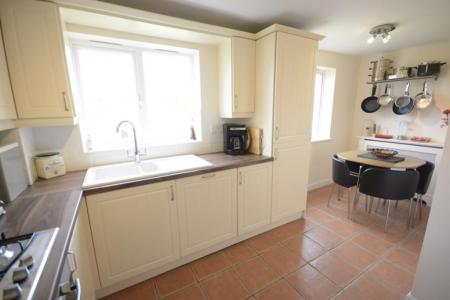 Two double glazed window to rear aspect, range of wall and base units in cream with roll top work surfaces in wood effect, one and a half bowl Belfast sink/drainer with central mixer tap, tiled splashbacks, built-in double electric oven, five ring gas hob with overhead extractor hood, integrated fridge/freezer and dishwasher, radiator with cover, ceramic tiled flooring and smooth coved ceiling.