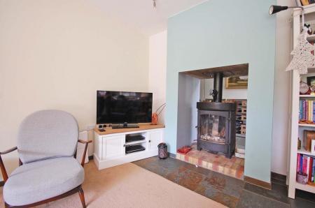 Double glazed window to front, storage cupboard, feature fireplace with tiled hearth and wood burner, carpet to floor and smooth ceiling.