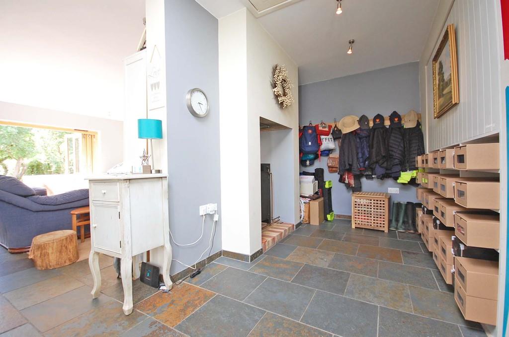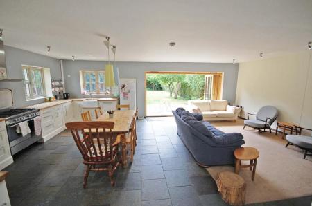 Open plan with feature wood burner, tiled flooring and smooth ceiling. To the rear is wall of bi-folding doors which open fully to the landscaped rear garden with South West facing aspect.