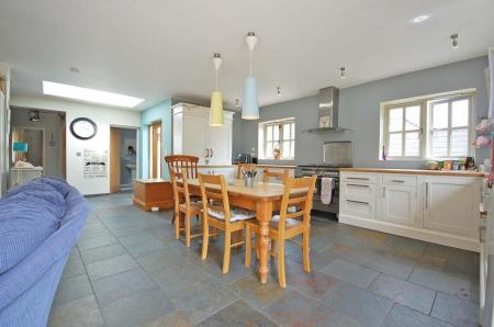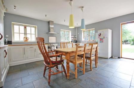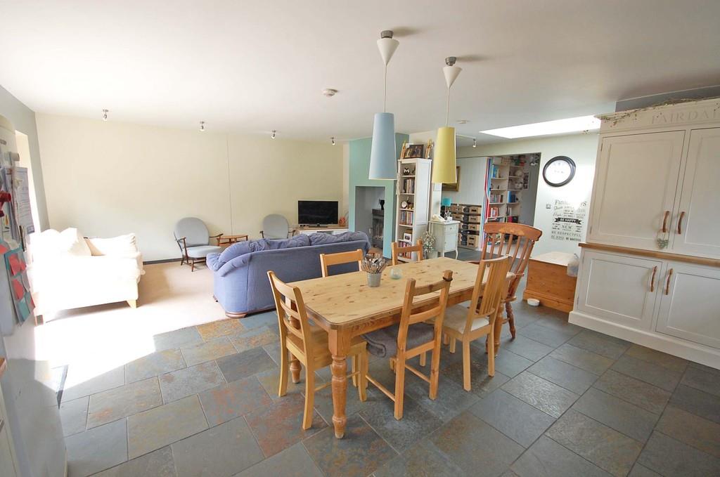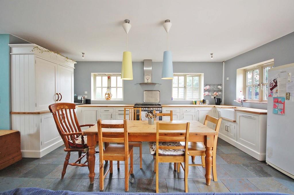Open plan with two double glazed windows to side and one to rear, a range of hand made bespoke fitted eye level and base level units with solid oak work surfaces incorporating a Butler sink with central mixer taps, Range cooker, integrated dishwasher, space for fridge/freezer, slate flooring and smooth ceiling.