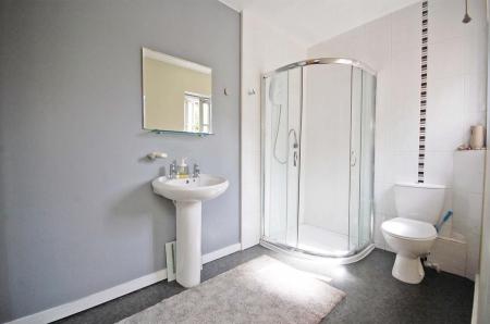 Opaque double glazed window to rear, fully tiled single shower, low level WC, pedestal wash hand basin, storage cupboard housing wall-mounted boiler, vinyl flooring and smooth ceiling with sunken spotlights.