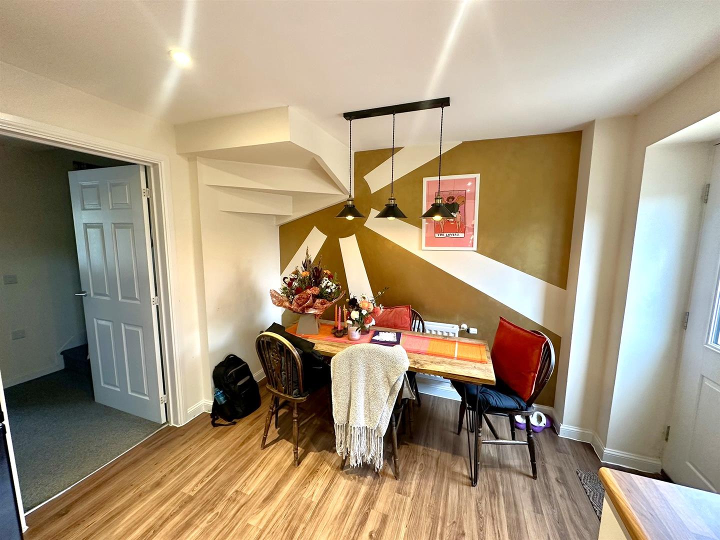 Kitchen / Diner - 4.67m x 3.05m (15'4 x 10'0) - The kitchen area comprises of a range of base and wall mounted units with laminated worktops and splashbacks, plumbing for washing machine, space for freestanding fridge / freezer, integrated Hotpoint oven with four ring gas hob and extractor fan over with stainless steel splashback, double radiator, electric boiler, inset spotlighting, rear aspect window with views towards Cleeve Hill, half glazed back door to the gardens.