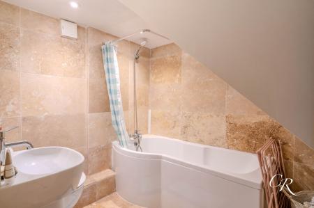 Bathroom: Finished in warm toned stone tiling, this stylish bathroom features a modern white suite comprising a curved panel bath with overhead shower, a contemporary wall-mounted basin, and a low level WC. The design makes excellent use of the space, with the sloped ceiling adding character while recessed lighting enhances the bright, fresh feel. Perfectly blending practicality and comfort, it offers a relaxing environment for daily routines.