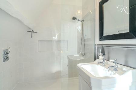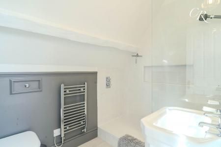 Shower Room (Second Floor): A separate shower room serves the upper floor, featuring a modern walk-in shower, WC, wash basin and heated towel rail ideal for guests or family use alongside the principal suite.