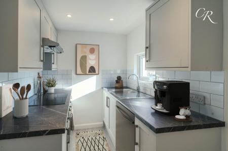 Kitchen: The contemporary kitchen is fitted with a range of sleek units and dark work surfaces, complemented by tiled splashbacks. Practical and stylish, it provides space for appliances and a layout designed for ease of use.