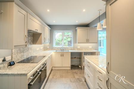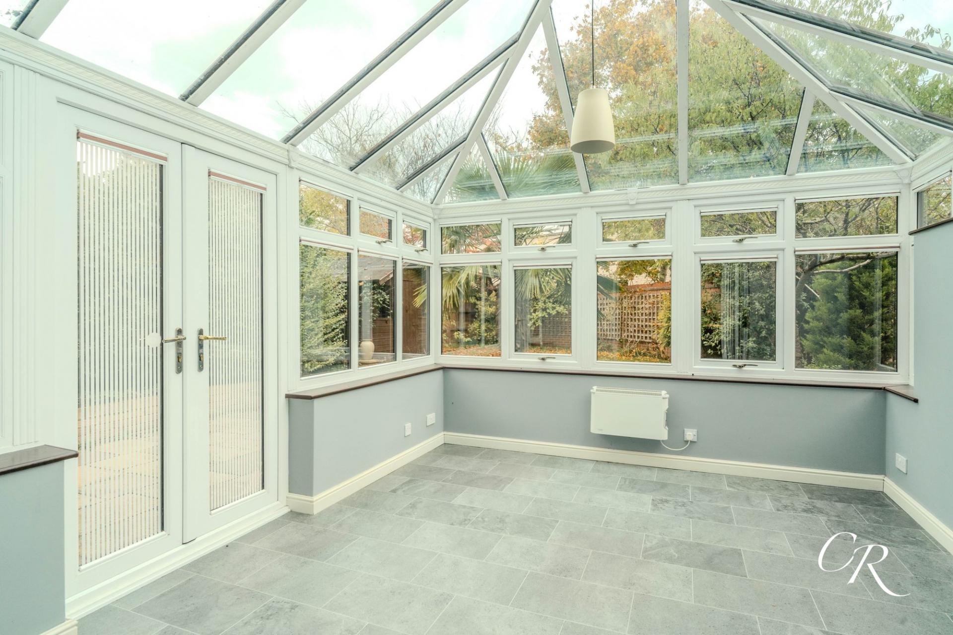 - Modern open-plan kitchen/dining room with bi-fold doors to conservatory
