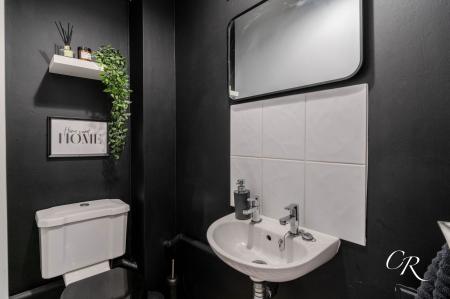 Cloakroom: Finished with striking dark décor and white tiling, the cloakroom offers a WC and wash basin a smart and practical addition for guests.