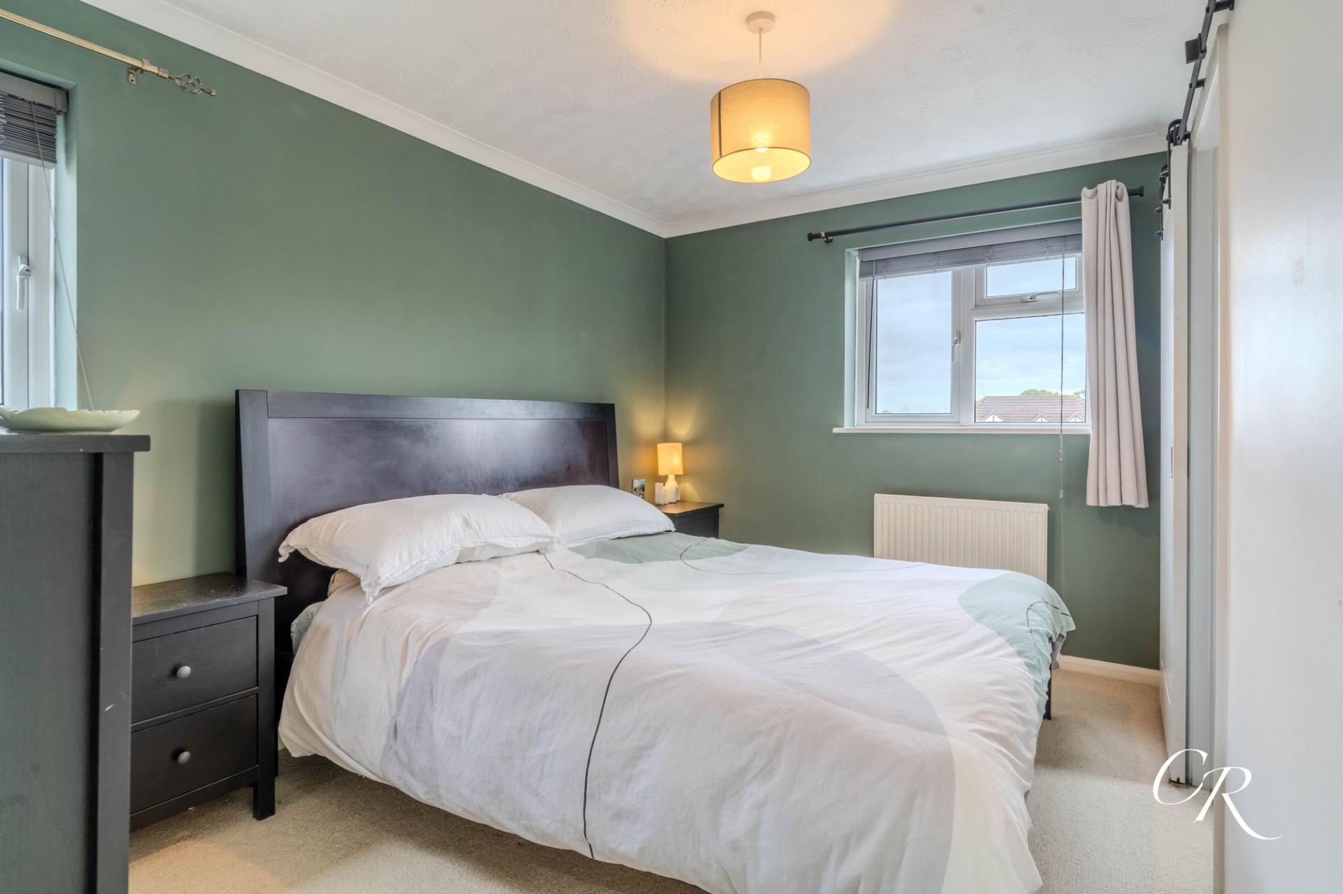 Bedroom Three: A comfortable double bedroom with built in wardrobe space positioned at the rear with views over the garden, presented in light, neutral tones.