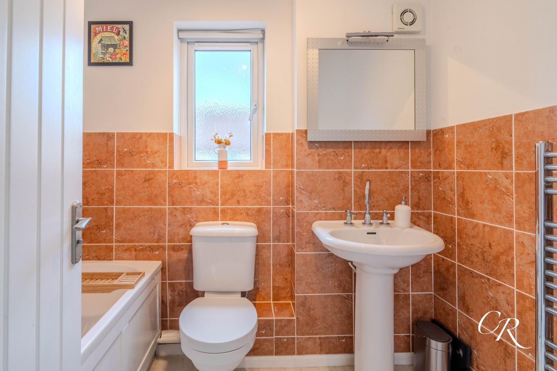 Family Bathroom: The family bathroom is fitted with a three-piece suite comprising panelled bath, pedestal wash hand basin, and WC. Warm-toned tiling and a heated towel rail add both style and practicality.