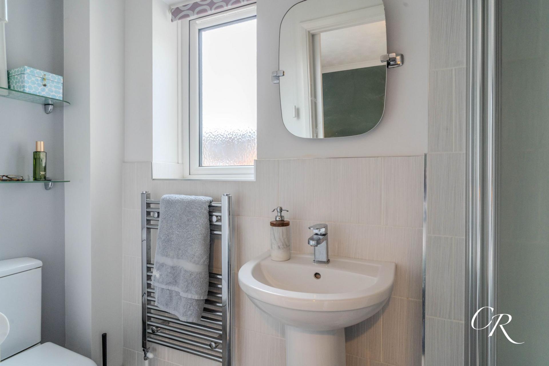 En Suite: Finished in a neutral style, with shower, wash basin, WC, heated towel rail, and tiling.