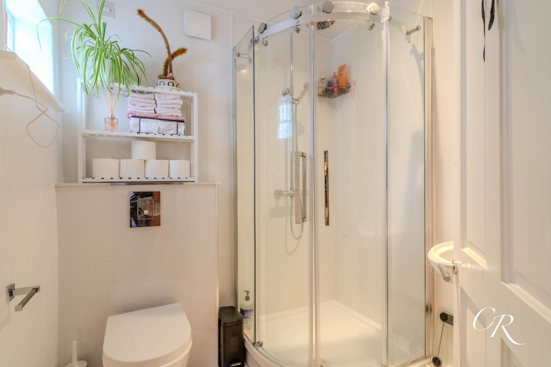 Shower Room: A well appointed space fitted with a corner shower enclosure and sliding glass doors, a concealed cistern WC, and a wall mounted hand basin. A frosted window provides natural light, while the layout maximises practicality and storage.
