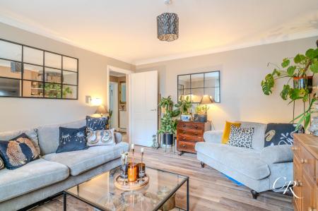 Living Room: Beautifully presented and generously sized, this inviting space features Karndean flooring, and neutral décor. A large sash window with plantation shutters brings in plenty of light, while built in shelving and a handy office nook add functionality.