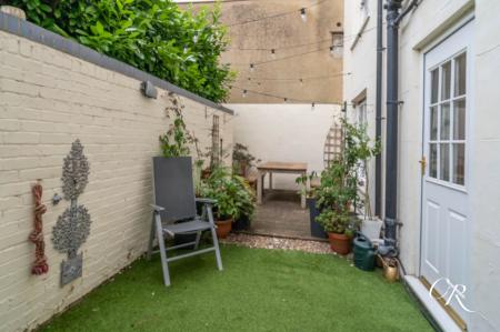 Garden: A private, low maintenance garden with painted brick walls, a decked seating area, and artificial lawn. Well suited for outdoor dining or container planting, the space benefits from a rear access door directly from the kitchen.
