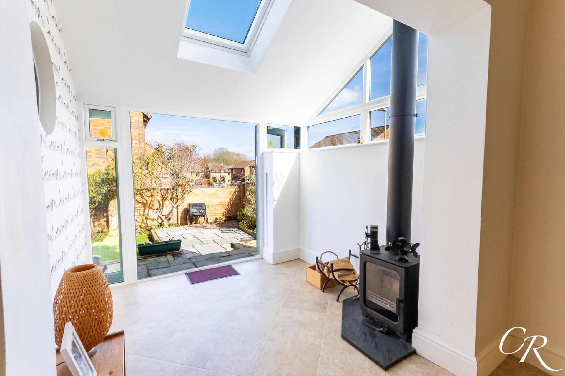 Conservatory: A particularly attractive addition to the home, featuring a vaulted ceiling with skylight windows and French doors opening onto the patio. The log burning stove provides a charming focal point, ensuring the room remains cosy and usable throughout the year.