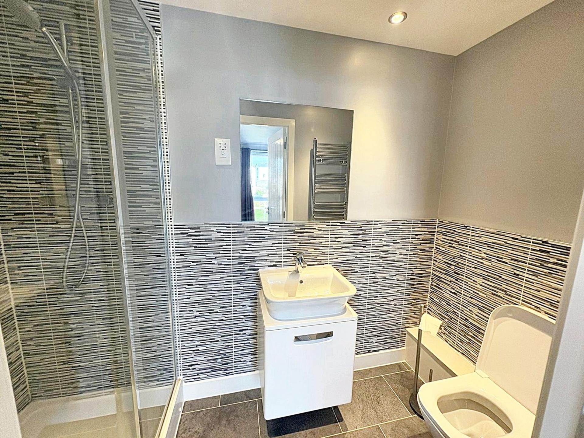 Ensuite Shower Room: Smart and stylish, the ensuite includes a walk in shower with modern tiling, a WC, basin with vanity storage beneath, heated towel rail, and recessed spotlights.