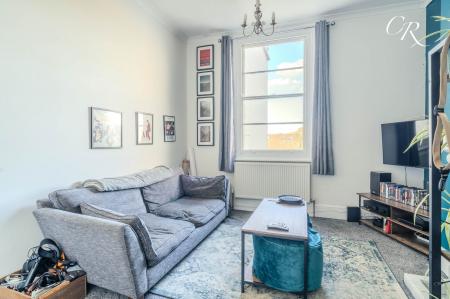 Sitting Room: The apartment opens into a beautifully light and airy sitting room, enhanced by a tall sash window that floods the space with natural light. High ceilings and a striking feature fireplace provide character, while the generous proportions create an inviting area for both relaxing and entertaining.