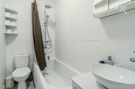 Bathroom: The bathroom has been fitted with a modern white suite, including a rainfall shower over the bath, a stylish vessel sink, WC, and chrome towel rail. A frosted window provides natural light while maintaining privacy.