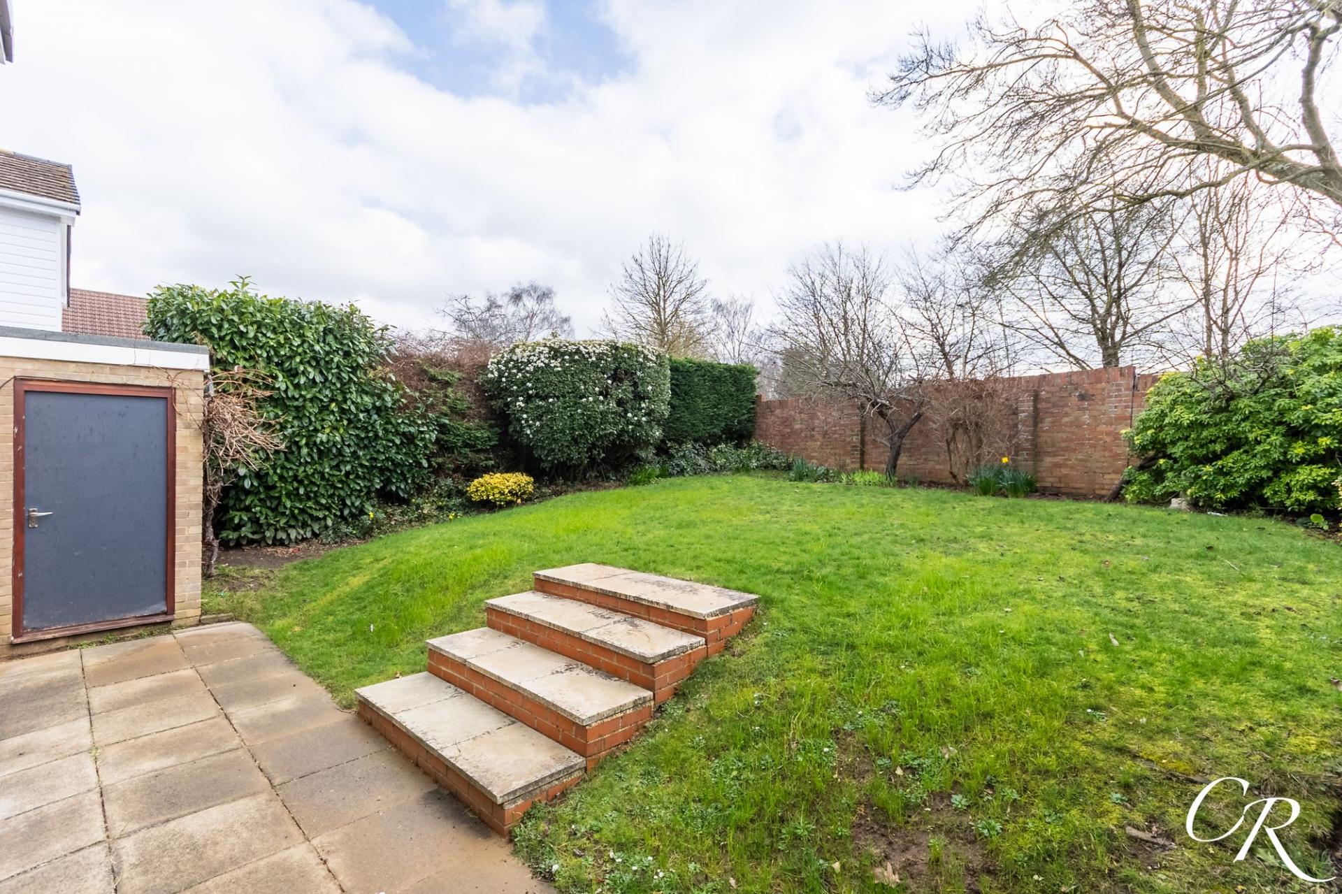 The rear garden is a particularly attractive feature, enjoying a sunny southerly aspect. Mainly laid to lawn with a paved patio area, it provides an ideal setting for outdoor dining, summer entertaining and family play. Mature shrubs and boundary planting create privacy, while pedestrian access leads directly from the garden into the attached garage, offering additional practicality.