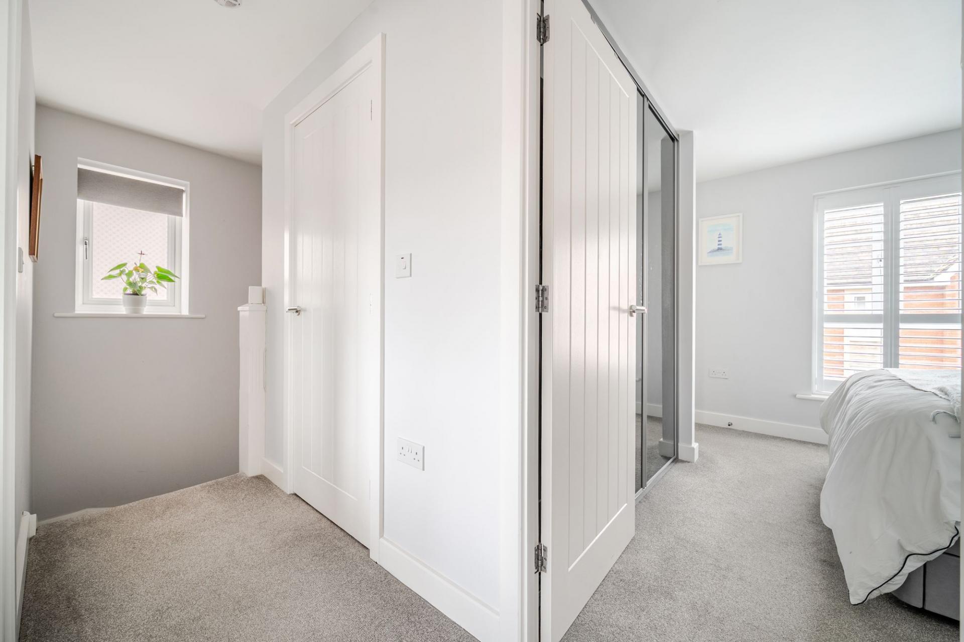 Landing: A bright landing provides access to all first-floor rooms. A window brings in natural light and there is access to the loft space above.