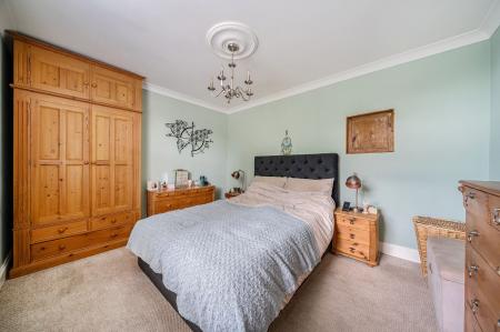 Bedroom One: A spacious double bedroom located on first floor 3 (see Floorplan). The room is comfortably carpeted and offers ample space for storage, including space for a wardrobe and additional furnishings. A ceiling rose and coving adds a touch of period charm.