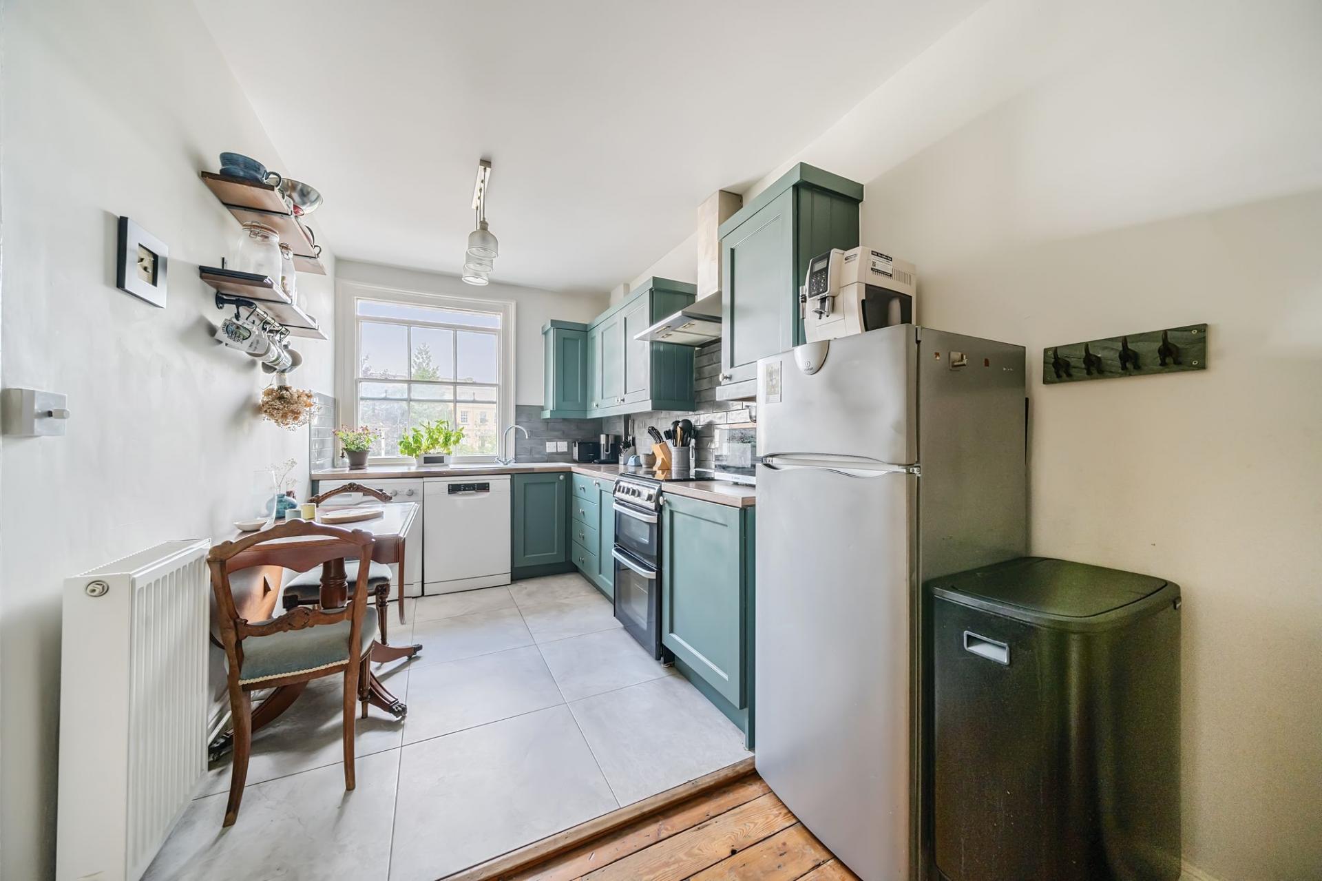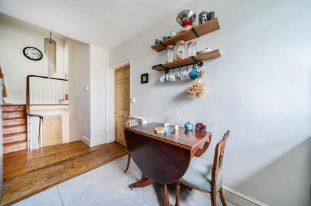 Kitchen & Dining Area: Positioned on the first floor 2 (see Floorplan), the kitchen features shaker-style units in a heritage green with tiled splashbacks and ample worktop space. A sash window fills the room with natural light, while the adjacent dining area includes open shelving and space for a table and chairs, creating a charming and functional setting.