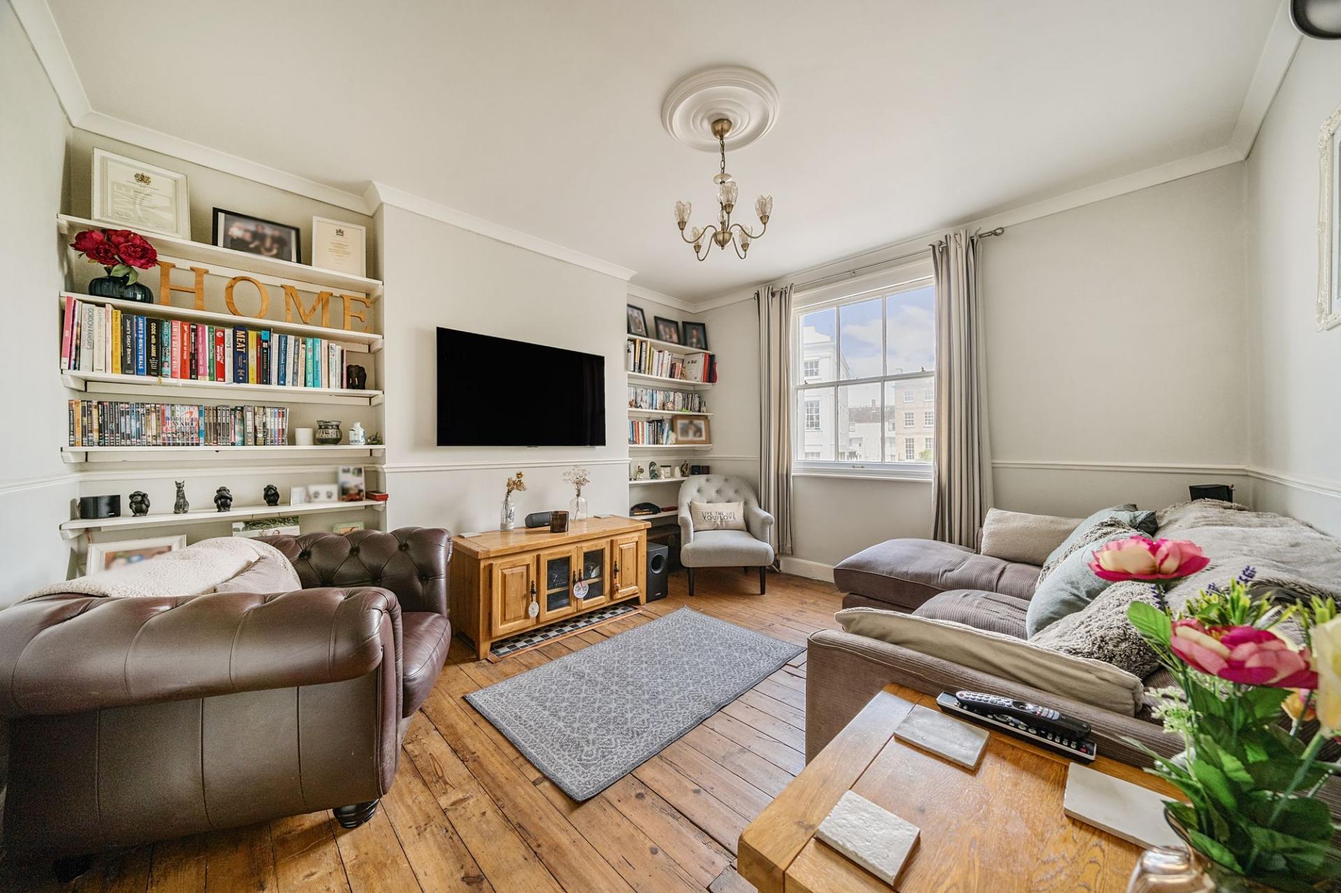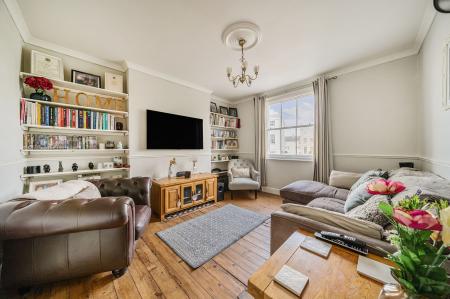 Living Room: Positioned on first floor 2 (see floorplan), this bright and inviting living room enjoys a pleasant front facing outlook through a large sash window, which fills the space with natural light. Period charm is complemented by stripped wooden flooring and elegant ceiling cornicing, while built in shelving to either side of the chimney breast provides practical storage and display space.