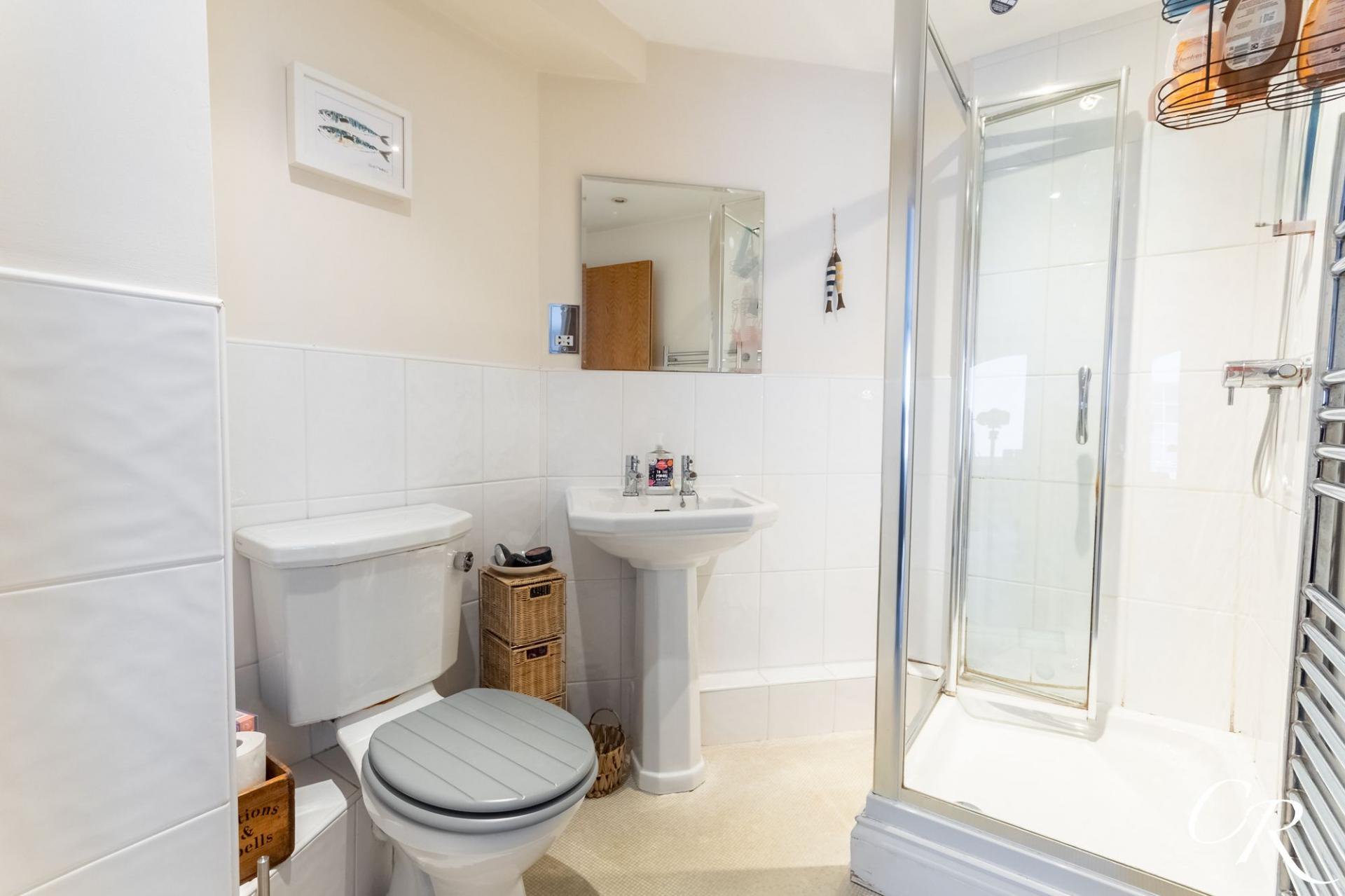 En Suite: Fitted with a shower enclosure, pedestal wash hand basin and WC, finished in neutral tones.