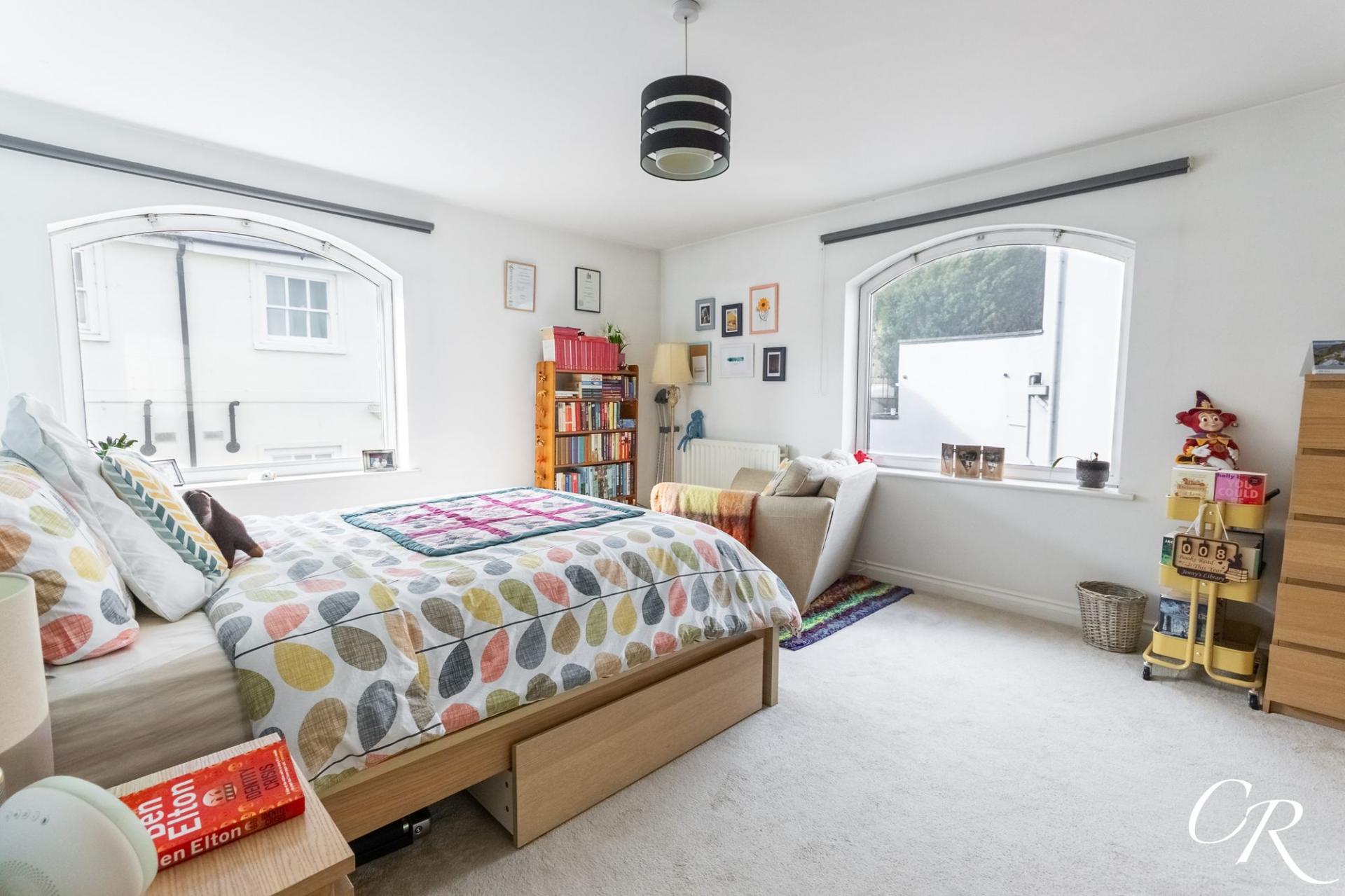Bedroom One: A particularly generous principal bedroom (15’9” x 12’8”) featuring dual arched windows that create a bright and airy feel. There is ample space for wardrobes and additional furniture, making this a comfortable and spacious retreat.