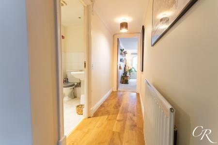 Entrance Hall: A welcoming and generously sized hallway with wood-effect flooring and a clean, neutral décor. Doors lead to all principal rooms, creating a practical and well-balanced layout with useful storage space.